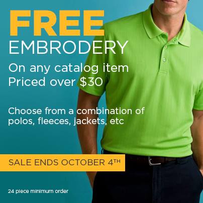 Tis the end of the 3rd quarter & we want to go out with a bang! To do so, we’re running some Killer print and embroidery specials. We can’t run these crazy deals for long, so don’t delay! Get your order placed & paid for by 10/4 to take advantage of this limited time offer!