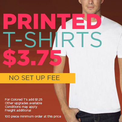 If you’ve been holding out on getting your company some screen printed Tees until you found a great deal, now is your time! This special is specifically for basic white Tees with a one color print and the best part is, there’s NO SETUP CHARGE! But don’t worry, if you’ve got your heart set on colored Tees, additional print colors, or printing on other areas of the shirt, there’s only a nominal extra fee. Minimum order 100 pcs. Send questions and inquiries to Melissa@locobranding.com.